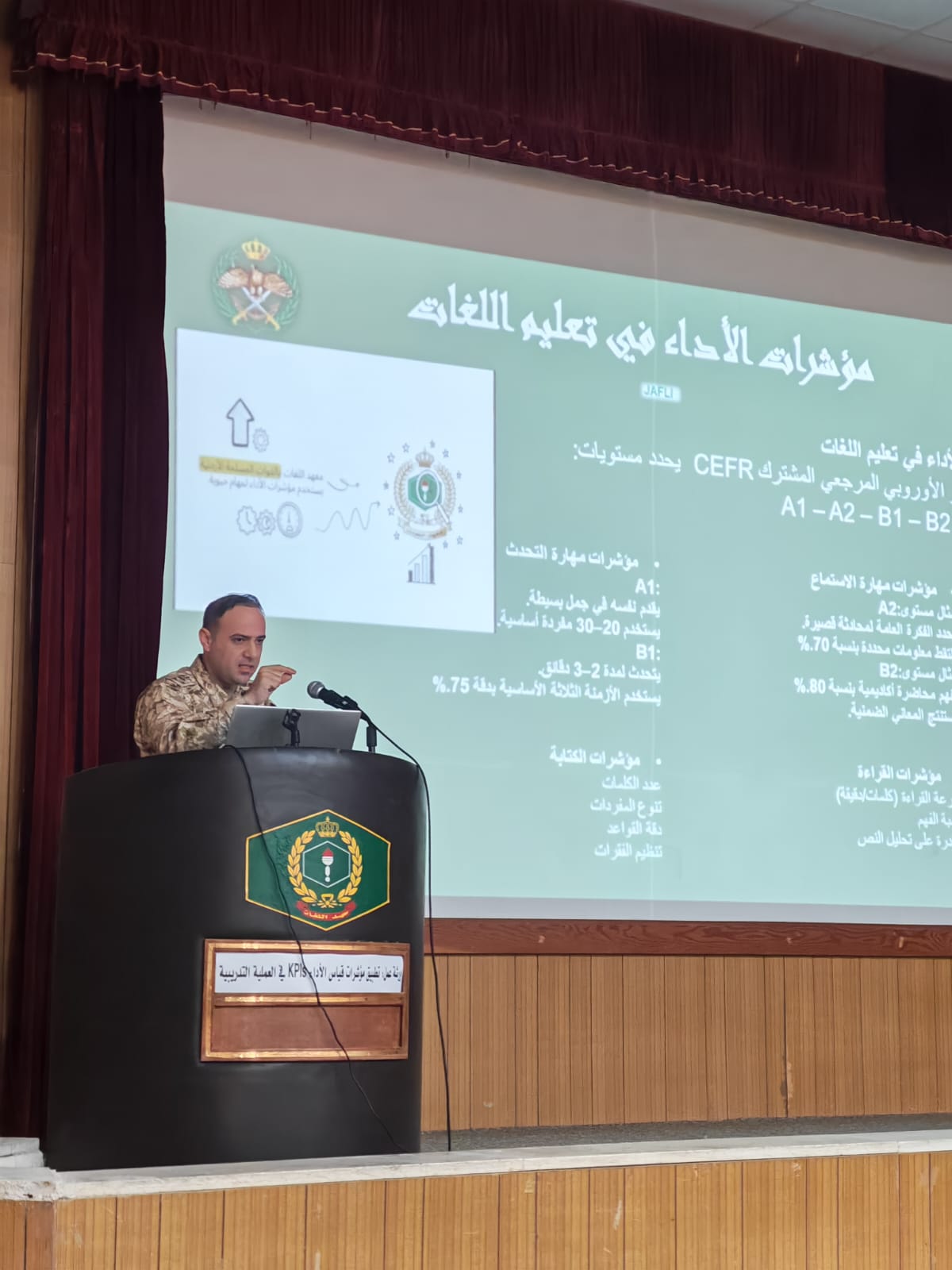 عُقدت في قيادة معهد اللغات يوم الأربعاء الموافق 4/3/2026 ورشة عمل بعنوان "مؤشرات قياس الأداء" وذلك بحضور عدد من الضباط المعنيين بشؤون التدريب والتخطيط في القوات المسلحة وهدفت الورشة إلى تطوير منظومة التدريب وتعزيزها من خلال وضع مؤشرات قياس دقيقة تسهم في تقييم الأداء ورفع كفاءة المخرجات التعليمية بما يتواءم مع أفضل الممارسات في مجال التدريب العسكري واللغوي كما جرى خلال الورشة مناقشة آليات تطبيق مؤشرات قياس الأداء على البرامج والدورات المختلفة بما يضمن تحسين جودة التدريب وتحقيق الأهداف الاستراتيجية للقوات المسلحة الأردنية – الجيش العربي وتأتي هذه الورشة ضمن سلسلة من الإجراءات التطويرية التي تنفذها مديرية التدريب العسكري للارتقاء بمستوى العملية التدريبية وتعزيز كفاءتها.